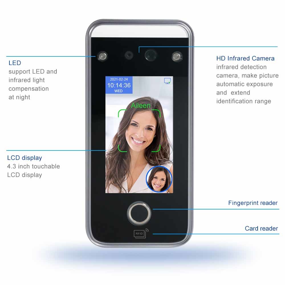 Instale en el soporte de la pared, puesto en la tabla, o instale en la puerta tursntile, fácil de utilizar y la instalación. TCP/IP estándar, RS485, USB, wifi para la comunicación. Proporcione el software libre y SDK, nube de la ayuda y app móvil