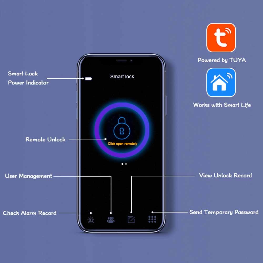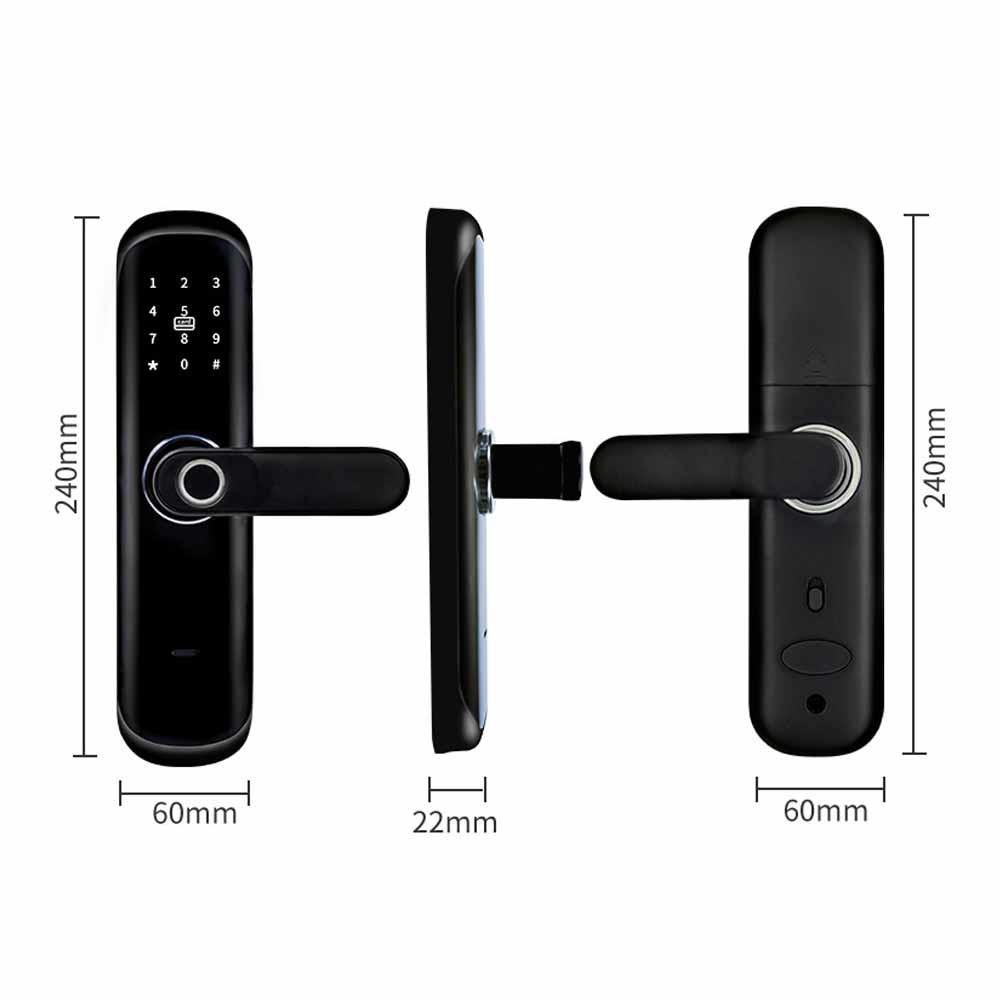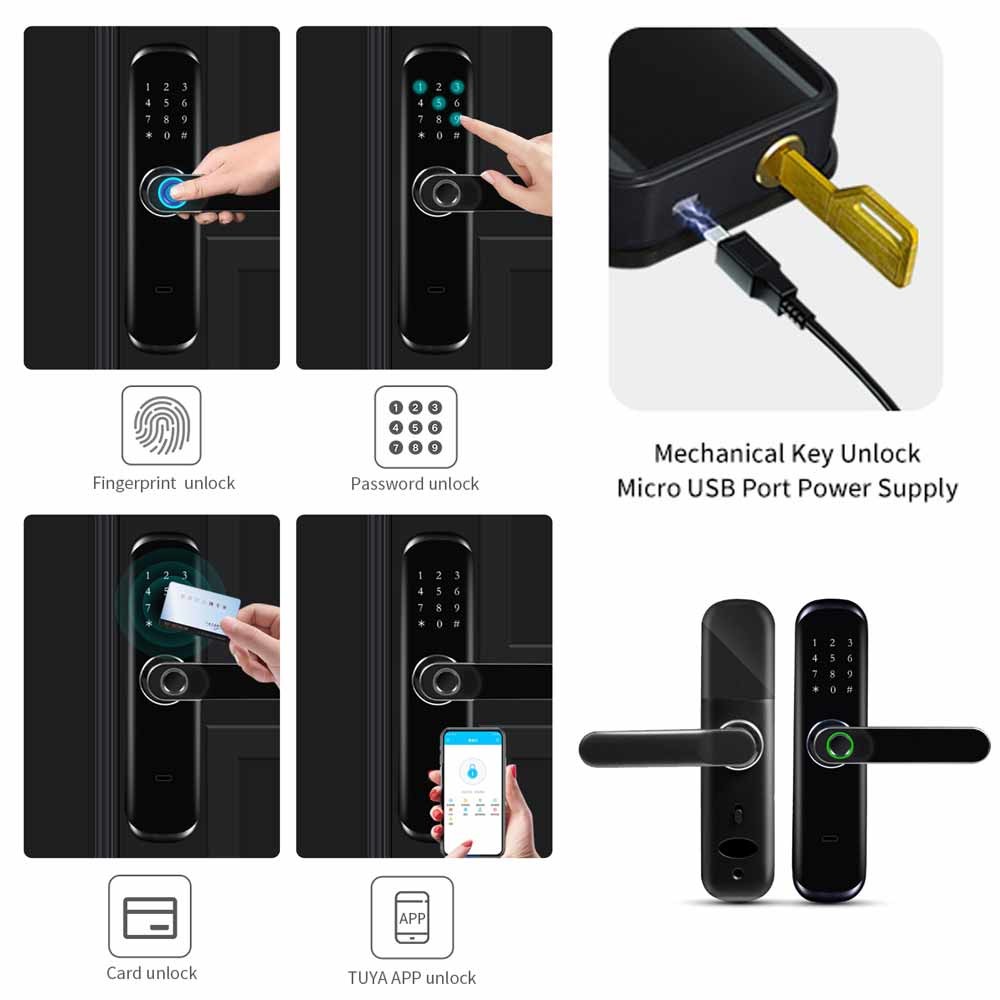 Tiene un conveniente maneja el sistema y 6 maneras de desbloquear: La huella dactilar desbloquea, BLE APP desbloquean, WiFi remoto desbloquea, contraseña PIN Unlock, la tarjeta desbloquea y las llaves mecánicas Unock.It cubrirán toda su necesidad sobre la cerradura elegante. Con la gestión avanzada del APP, vía WiFi o BLE conectar la cerradura elegante con su smartphone, y usted puede manejar su cerradura de puerta elegante dondequiera y en cualquier momento.